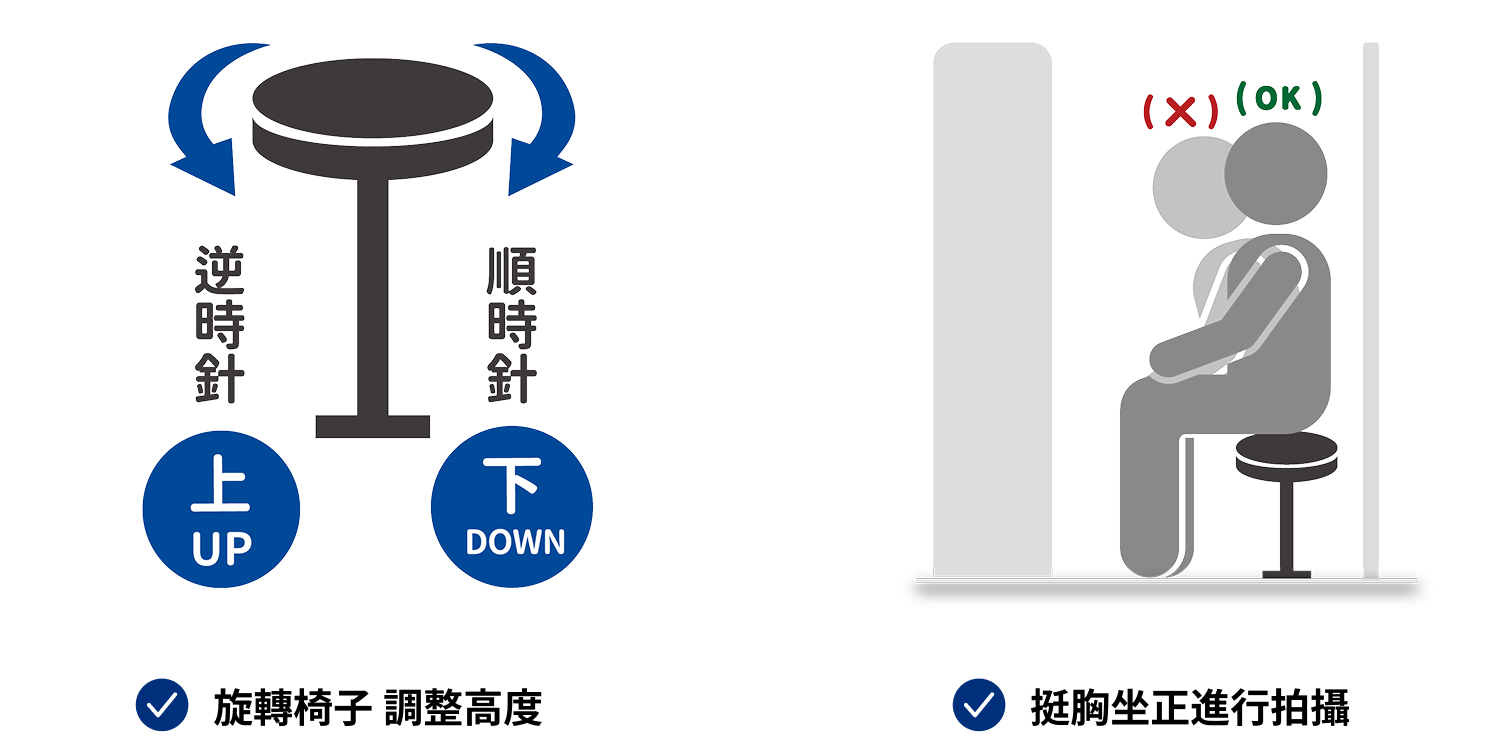 三、請旋轉椅子調整高度,並挺胸坐正進行拍攝